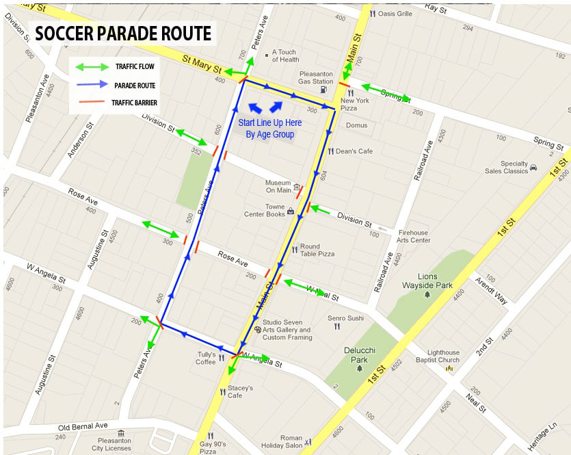 - 6:45am: If you are attending the parade this year, please arrive at St. Mary and Main in downtown Pleasanton to line up and assemble with your team.