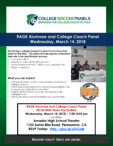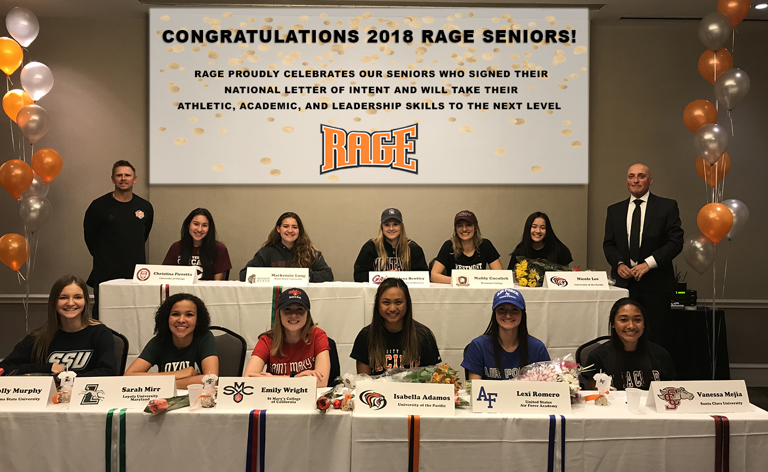 RAGE proudly celebrates our seniors who signed their National Letter of Intent and will take their athletic, academic, and leadership skills to the next level as they move on to their chosen colleges and universities. These athletes gathered on February 7th to be honored for their commitment to play collegiate soccer next Fall.