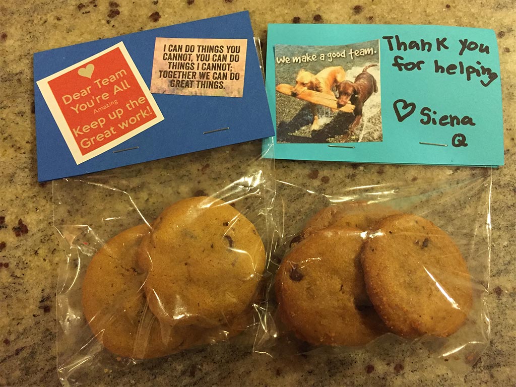 First, I called the Sherri, the person who is the head organizer for KAH, to book a date to pack food. I hoped to get at least 20 people packing food on December 15, 2016. Then, I called some of my friends that I knew played soccer. I asked them if they could bring some friends from their teams to the packing event. I also sent an email to current and past teammates. It was hard to get volunteers because it was a busy time of year. The last few days before the event, I finally saw people signing up. Over 40 people signed up and came to my packing event. Finally, I made chocolate chip cookies for the kids and adults who participated in the event. I put a tag on it with a lot of inspirational quotes on it.
