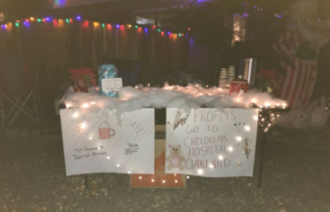 Lexi and I are on the U13 elite and premier teams. We decided to raise money to buy toys for the patients at Children's Hospital Oakland by selling hot chocolate at a Christmas light show in Livermore. It was cold and rainy, so not many people stopped by our stand. We decided to walk around and sell the hot chocolate to people standing in line. Our strategy was a success and we sold out within 2 hours.